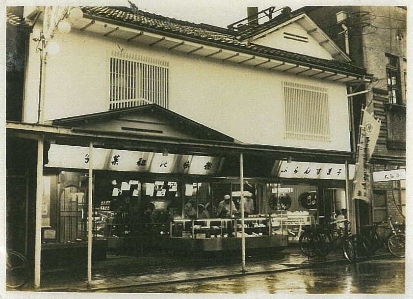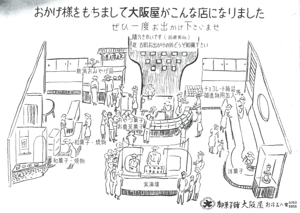 昭和28年、新潟古町店がそれまでの間口を2倍に拡張しました。向かって半分は和菓子売場、右半分が洋菓子売場。奥には茶寮を設置、そしてバックルームには小さな和生菓子仕上げ工場がありました。