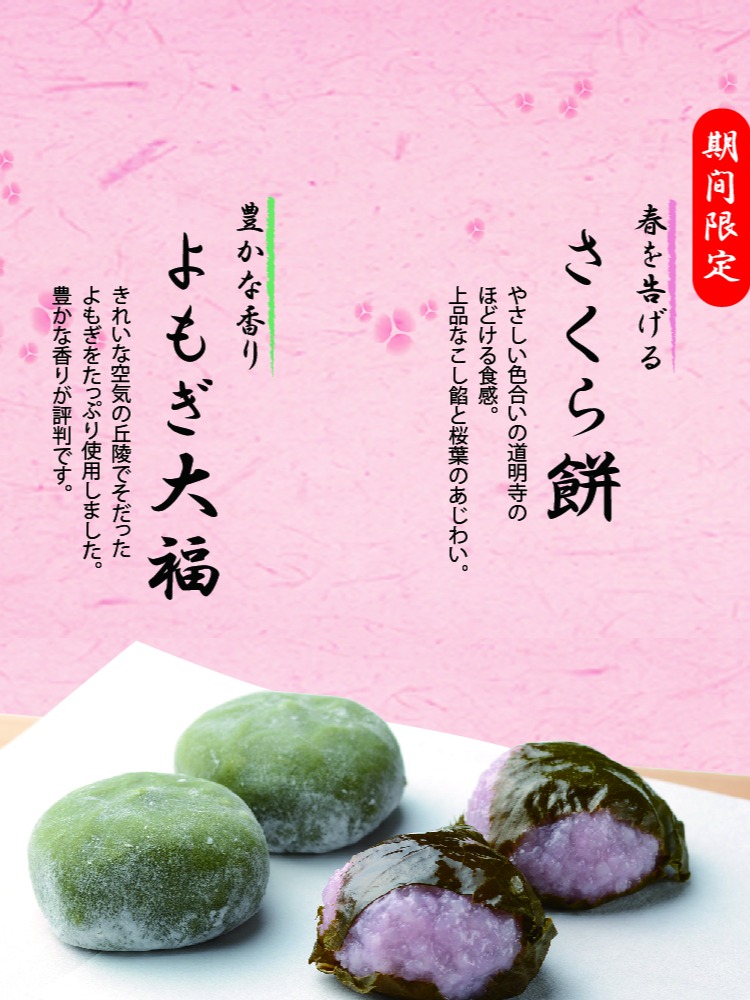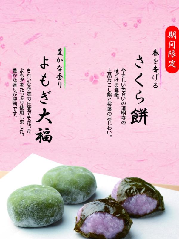 2026年02月05日(木) 【2月6日発売】よもぎ大福・さくら餅 2月6日(金)より春・季節限定「よもぎ大福」と「さくら餅」を発売いたします。 まだまだ寒い日が続いておりますが、ひと足早く”春の香り”をお楽しみください。 よもぎ大福 1個 170円 / さくら餅 1個 190円