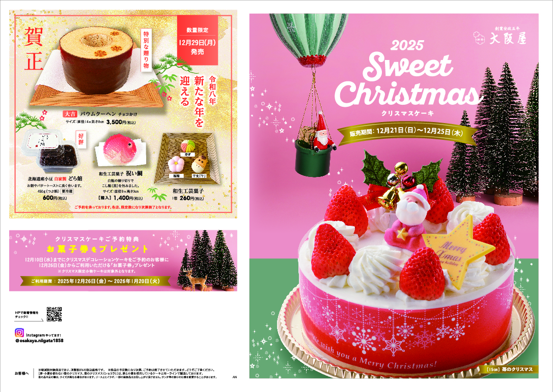 2025年11月29日(土) 【12/21~25発売】クリスマスケーキご予約承っております 2025クリスマスケーキご予約承っております。 【ご予約特典】12月10日(水)までにクリスマスデコレーションケーキをご予約のお客様に『お菓子券』をプレゼント!! ※プリンアラモード、ノエル、フルーツサンタはご予約特典対象外となります。 ※ウオロク各店、またイオン県央店ではクリスマスデコレーションケーキをご予約のお客様に『いちごのブッセ2個』プレゼントいたします。 (お菓子券のプレゼントはございません)