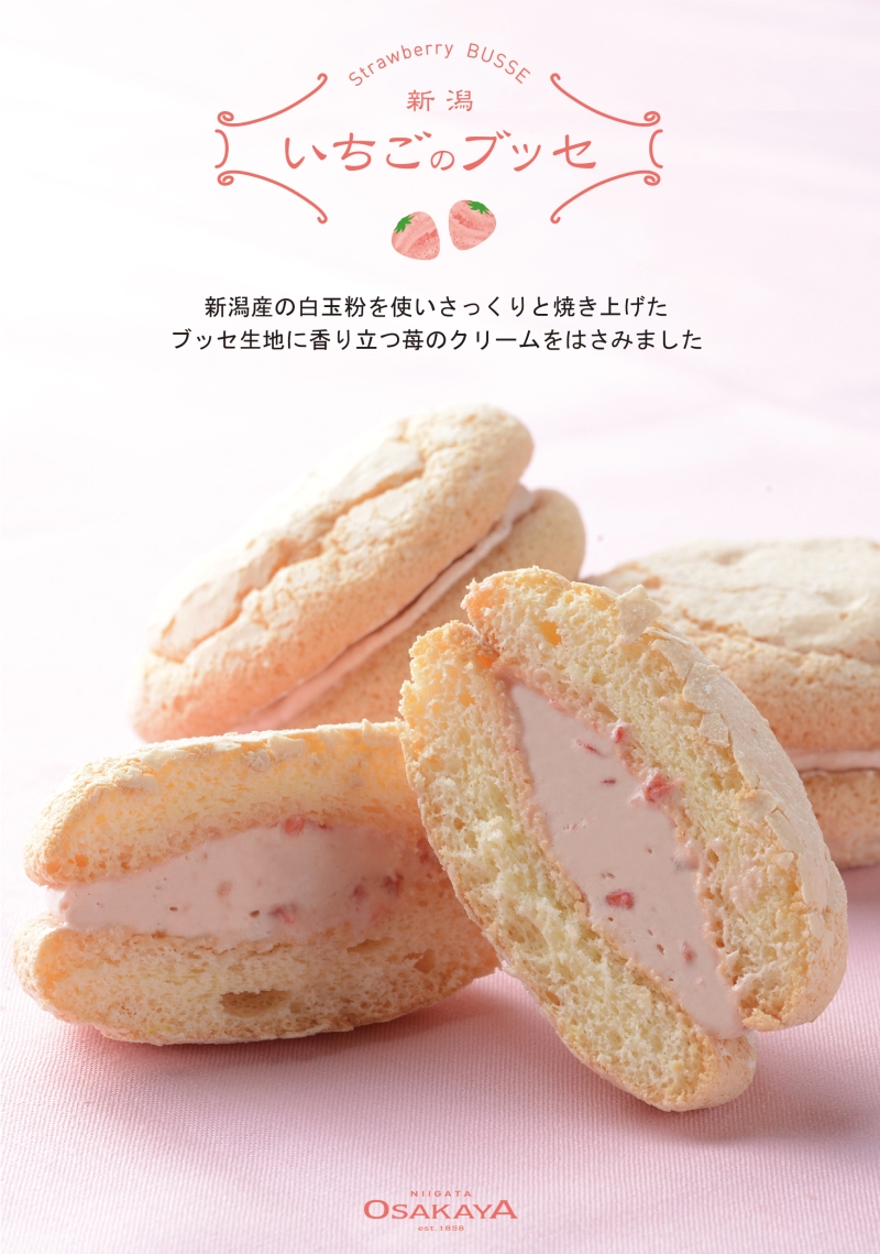 新潟米の白玉粉を使いさっくりと焼き上げたブッセ生地にフリーズドライいちご入のいちごクリームをサンドしました。