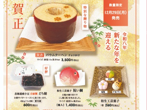 2025年12月12日(金) 【12月29日発売】お正月商品 ご予約を承っております 12月29日より期間・数量限定にてお正月商品を発売いたします。 毎年人気の和生工芸菓子やどら餡、特別な贈り物に「大吉バウムクーヘン」などお正月を彩る商品を取り揃えております。