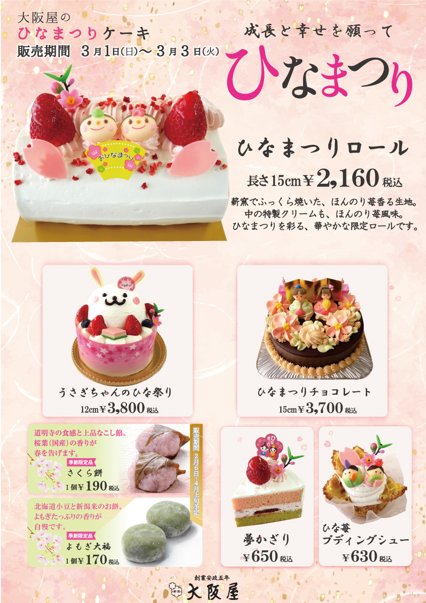 2026年02月05日(木) 【ご予約承っております】ひなまつり祝菓 お子様の健やかな成長としあわせを願う桃の節句『ひなまつり』のお祝いに大阪屋のケーキ、和生菓子と一緒に 楽しいひとときをお過ごしください。ご予約承っております。